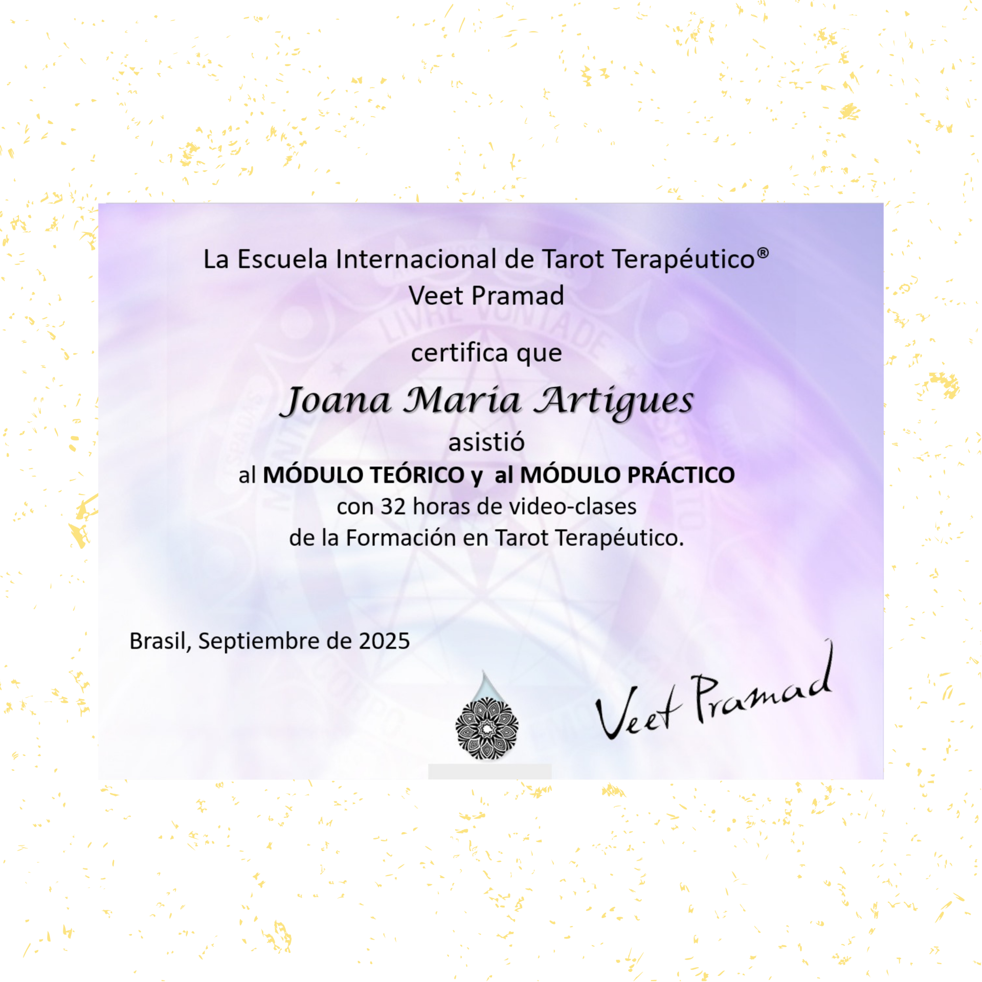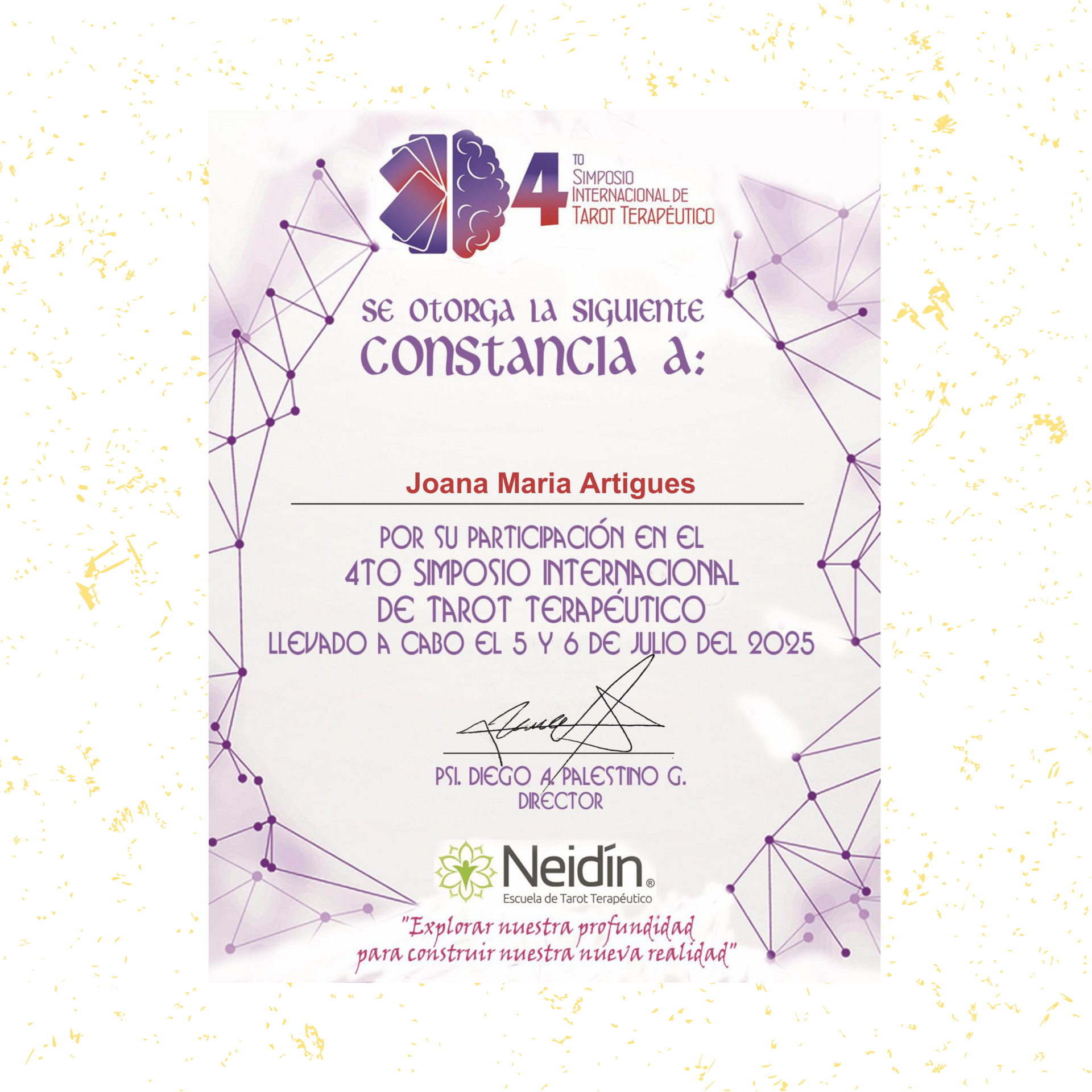 Como profesional comprometida, mantengo mi adhesión al Código Ético de Tarot y aseguro la honestidad en cada encuentro. Mi compromiso con la actualización del sector también se refleja en el respaldo de los eventos de la Red Internacional de Congresos de Tarot, donde participo de manera activa - oyente - para integrar las últimas corrientes de la disciplina. Este aval institucional garantiza un servicio de calidad y precisión.