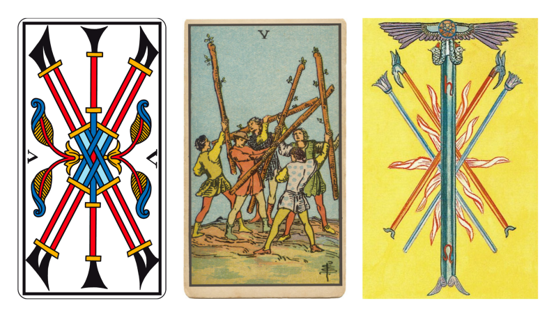 El Cinco de Bastos simboliza la competencia, el conflicto menor y la diferencia de opiniones. Representa una disputa energética donde varios intereses o egos chocan en un desafío, más lúdico que violento. La carta invita a la confrontación creativa, a defender las propias ideas con vigor y a canalizar la tensión hacia una sana rivalidad. Es un llamado a la asertividad, a participar en el debate con respeto y a recordar que la diversidad de enfoques puede enriquecer el resultado final.
