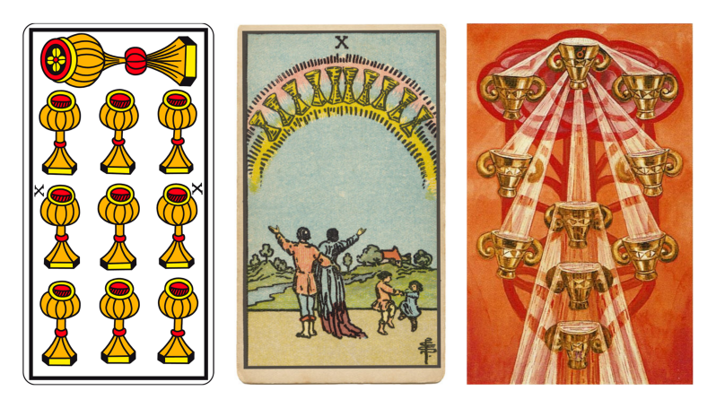 Con la energía de El Diez de Copas manifiestas la plenitud y la culminación, representando el éxito familiar y la alegría doméstica. Asumes el reposo y la satisfacción porque has sellado el ciclo de los afectos y encontrado el hogar que deseabas, sintiendo la saturación emocional; Vives la necesidad de la inmolación, sabiendo que esta plenitud requiere una vía de escape para liberar el impulso y permitir la renovación del ciclo.