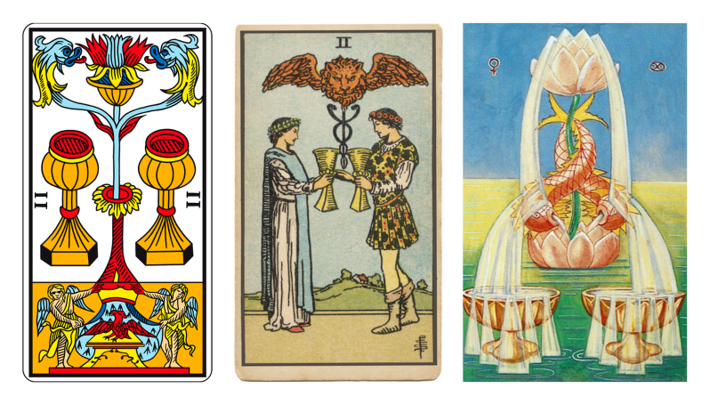 Con la energía de El Dos de Copas manifiestas el acuerdo y la unión, representando la convergencia armoniosa de principios complementarios. Asumes la conexión y el compromiso porque intercambias afecto genuino con un vínculo recíproco, logrando el equilibrio psíquico; Vives la celebración del lazo, sabiendo que alcanzas un gran bienestar mediante el reconocimiento mutuo.