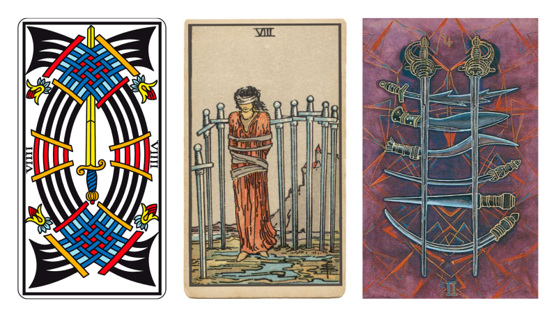 Con la energía de El Ocho de Espadas manifiestas la restricción y la parálisis, representando el conflicto de ideas y el auto-sabotaje. Asumes la impotencia y el encierro porque te sientes atado por juicios o pensamientos limitantes, sin usar el poder de la mente para liberarte; Vives la interferencia mental, sabiendo que la liberación requiere el poder de tu voluntad para romper las cadenas autoimpuestas.